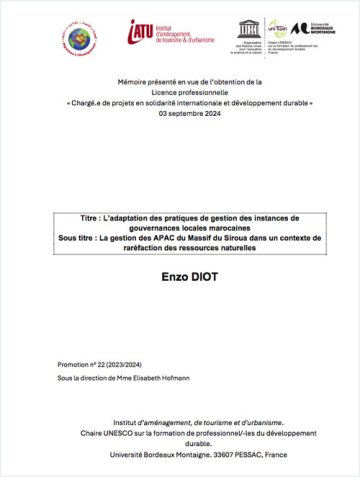 Ce mémoire a été rédigé dans le cadre d’un stage de cinq mois, effectué au sein du projet AGIR de Migrations et Développement (M&D) dans la ville de Taliouine au Maroc.
